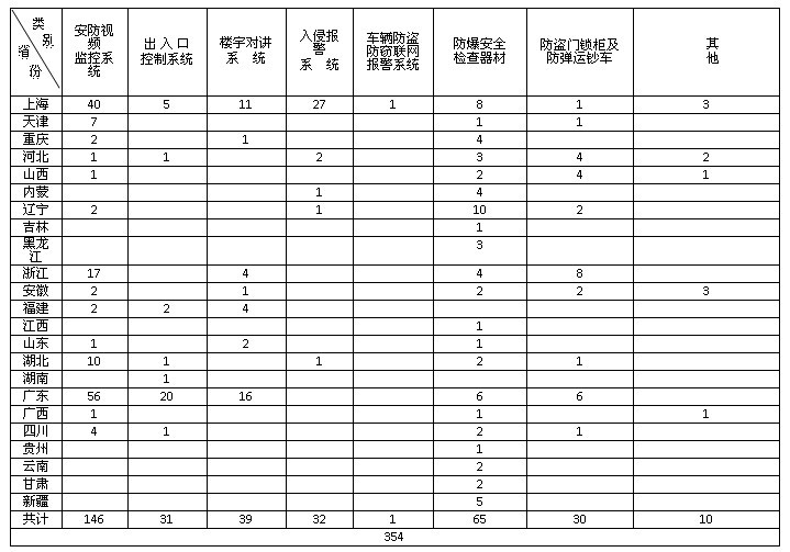 一、個省、自治區(qū)、直轄市獲得生產(chǎn)登記批準書的安防產(chǎn)品生產(chǎn)企業(yè)數(shù)量(354共家):