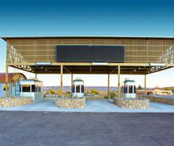 美國(guó)BIGEnterprises,Inc公司新開(kāi)發(fā)了一種雙層的、可應(yīng)對(duì)極端天氣情況的崗?fù),主要用于邊境檢查站。該崗?fù)け痪薮蟮膰鷫Νh(huán)繞,在極端天氣情況下檢查過(guò)往的卡車或是其他交通工具。警衛(wèi)站在崗?fù)?nèi),可以直接通過(guò)目光檢查地面上通過(guò)的車輛,而不需要走到崗?fù)ね饷嫒。該設(shè)施具有很強(qiáng)的防彈性能,并配置了多種供電設(shè)施以支持報(bào)警、攝像監(jiān)控和其他通信功能。崗?fù)ろ敳垦b有空調(diào)系統(tǒng),同時(shí)輔助有備用加熱和地板加熱裝置。