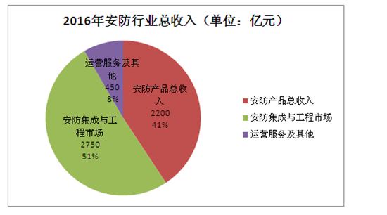 从产业构成来看,在安防行业总收入中,2016年安防产品总收入约为2200亿元,安防集成与工程市场约为2750亿元左右;运营服务及其他约为450亿元左右(见下图)。