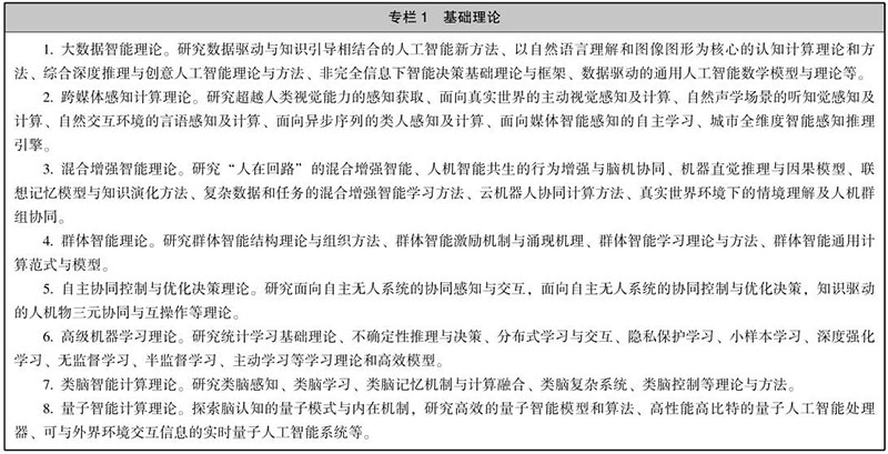 “1”是指新一代人工智能重大科技项目,聚焦基础理论和关键共性技术的前瞻布局,包括研究大数据智能、跨媒体感知计算、混合增强智能、群体智能、自主协同控制与决策等理论,研究知识计算引擎与知识服务技术、跨媒体分析推理技术、群体智能关键技术、混合增强智能新架构与新技术、自主无人控制技术等,开源共享人工智能基础理论和共性技术。持续开展人工智能发展的预测和研判,加强人工智能对经济社会综合影响及对策研究。