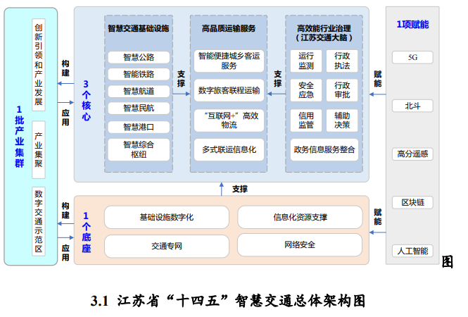 江苏省“十四五”智慧交通总体架构为“1311”——1个底座、3个核心、1项赋能、1批产业集群。1个底座——信息化基础底座。3个核心——智慧交通基础设施、高品质运输服务、高效能行业治理。1项赋能——新技术深度融合。1批产业集群——智慧交通产业高地。