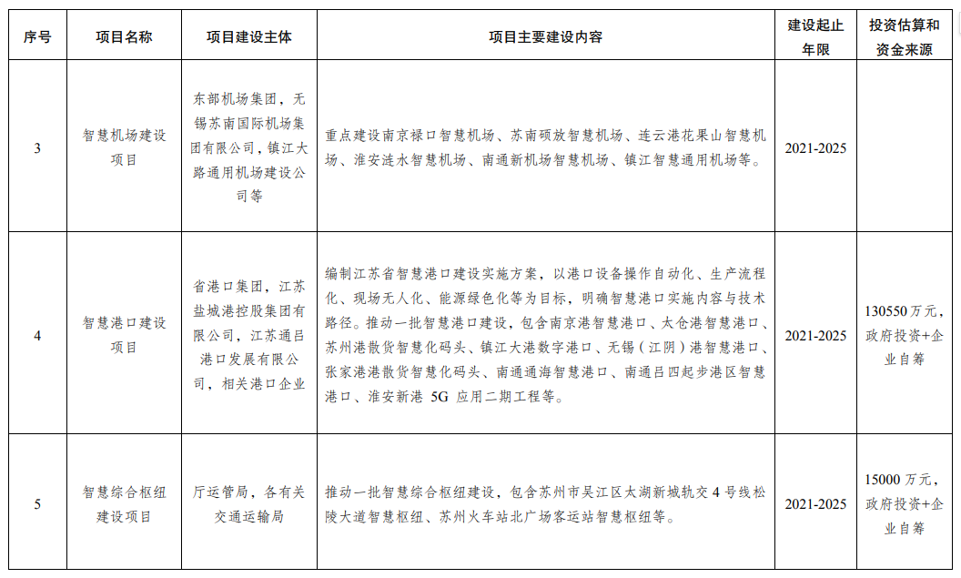 基础设施数字化。完成一批智慧公路、智能铁路、智慧航道、智慧民航、智慧港口和智慧综合枢纽等智慧交通基础设施建设。推动新建、改扩建高速公路和普通国省道公路同步开展智慧公路建设,实现“增量”提质升级,同时以沿江地区、苏南片区、南京都市圈等为重点,完成存量公路智慧化升级1200公里以上,实现“存量”挖潜增效,并在约200公里道路上实现车路协同。以推动京杭运河江苏段走在全国内河航运发展前列为重点,完成京杭运河江苏段全线智慧航道建设,存量航道智慧化升级达到700公里以上,并在重点航段实现有人干预下的船舶自主航行示范。