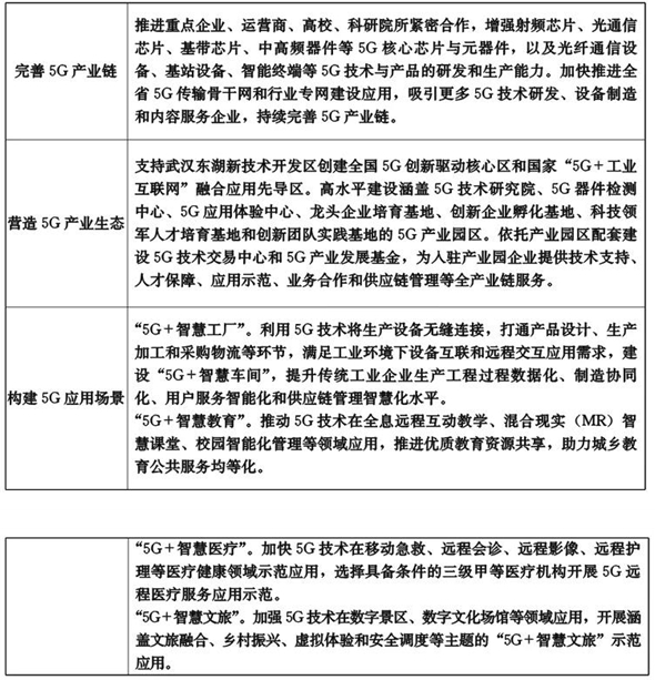 加快推动5G网络建设应用。以交通枢纽、体育场馆、旅游景点等人流密集区域和国家新型工业化产业示范基地等产业密集区域为重点,加强全省5G基站建设布局。协同推进5G承载网、核心网建设,加速5G独立组网(SA)规模商用,建成覆盖广、速率高、体验好的5G精品网。在实现各市州主城区5G网络全覆盖的基础上,加快推进5G网络向县城、乡镇和重点行政村延伸覆盖。加强5G技术创新应用,面向超大连接、超高速率、超高流量密度、超低时延等关键业务需求,构建“5G+”垂直行业应用场景,加快推动“5G+工业互联网”“5G+智慧工厂”“5G+虚拟现实/增强现实(VR/AR)”“5G+教育”“5G+医疗”“5G+文游”等应用场景落地。