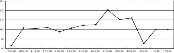 2022年四季度,外贸出口景气指数为100,比上季度下降了5个百分点,与去年同期相比下降了3个百分点,位于"微景气区间"(见图35)。其中,有33%的调查企业国外订单有了新的增长,比上季度上升了7个百分点;有34%的企业反映销售"持平",比上季度下降了19个百分点;有33%的企业反映"下降",比上季度上升了12个百分点。